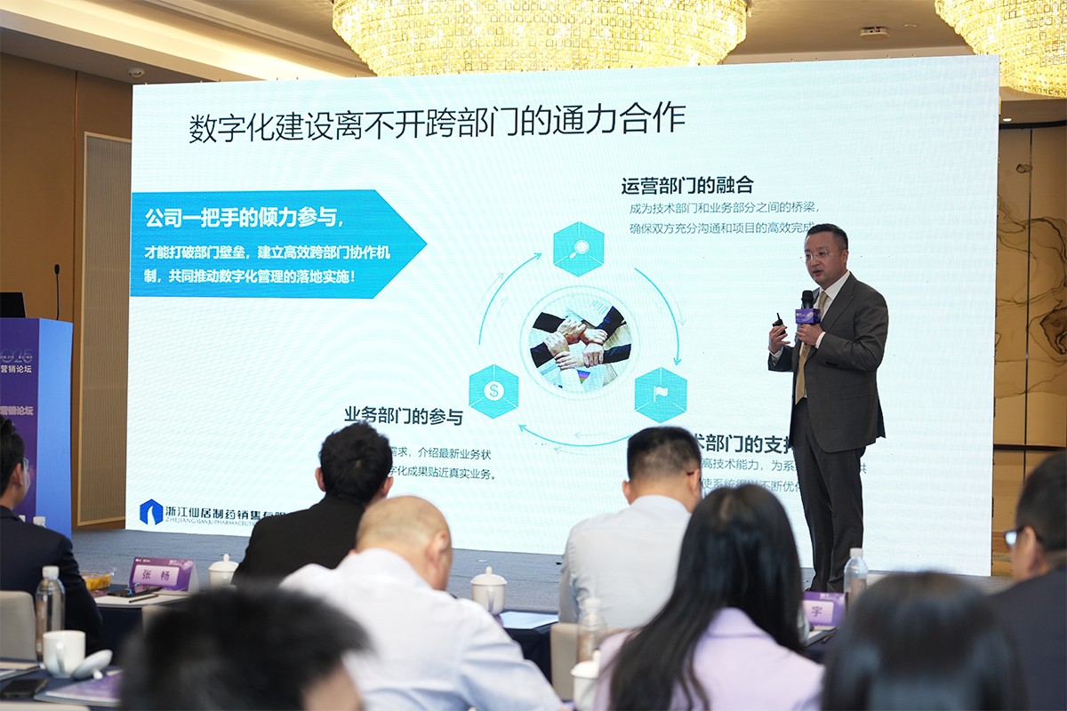 分論壇二聚焦“企業(yè)數(shù)字化轉(zhuǎn)型與健康渠道管理”。由浙江仙居制藥銷售有限公司CE總監(jiān)魯靜擔(dān)任主持人。浙江仙居制藥銷售有限公司總經(jīng)理鄒文輝從管理實(shí)踐角度,解析數(shù)字化轉(zhuǎn)型的落地路徑。廣州醫(yī)藥、四川金仁醫(yī)藥、艾昆緯、中康等企業(yè)高管圍繞供應(yīng)鏈智能化、終端渠道精細(xì)化運(yùn)營展開討論。
